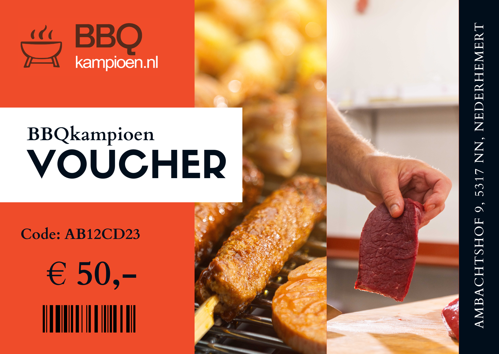Na de betaling ontvang je de cadeauboncode automatisch in je mailbox. Wil je een opgemaakte versie per mail ontvangen zoals op de afbeelding? Stuur dan even de mail door naar party@bbqkampioen.nl. dan maken wij er een mooie voucher van.