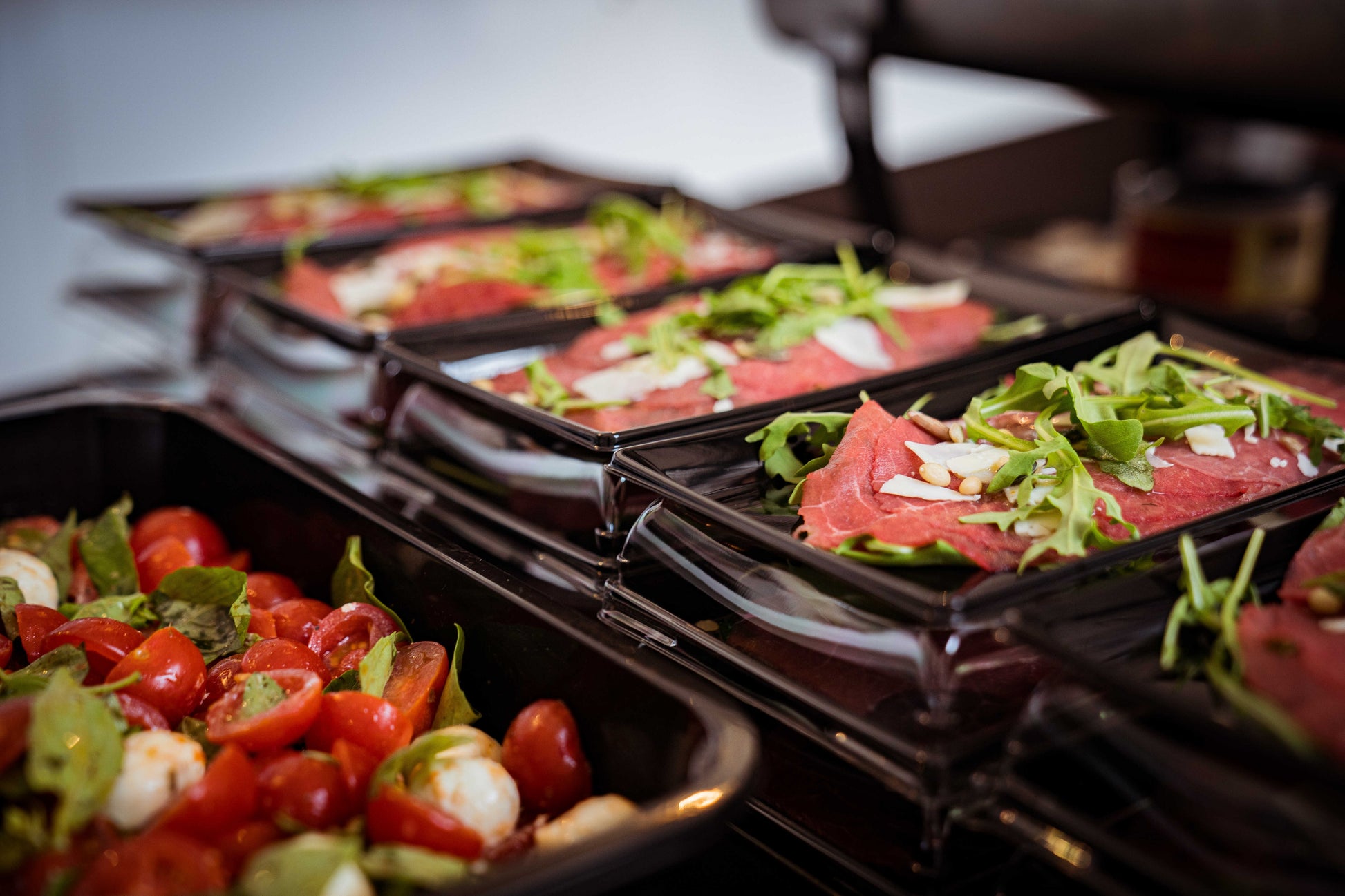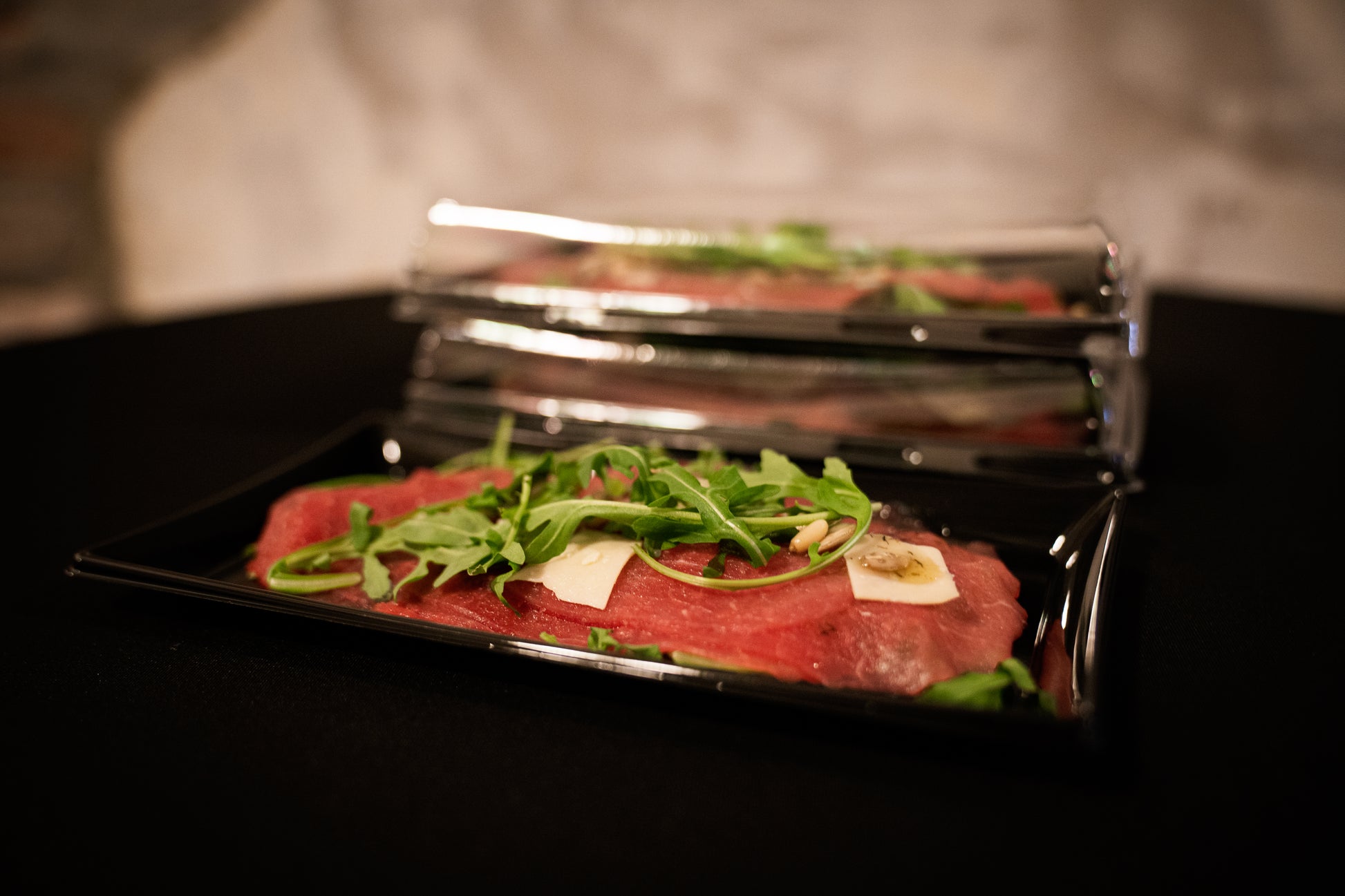 Ambachtelijke carpaccio van de slager met Parmezaanse kaas, pijnboompitten, rucola en frisse dressing.