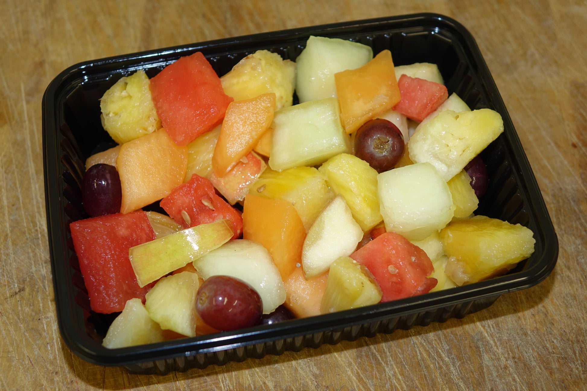 Heerlijke verse fruitsalade met onder andere galiameloen, ananas, watermeloen, druiven, Cantaloupe meloen en aardbeien.