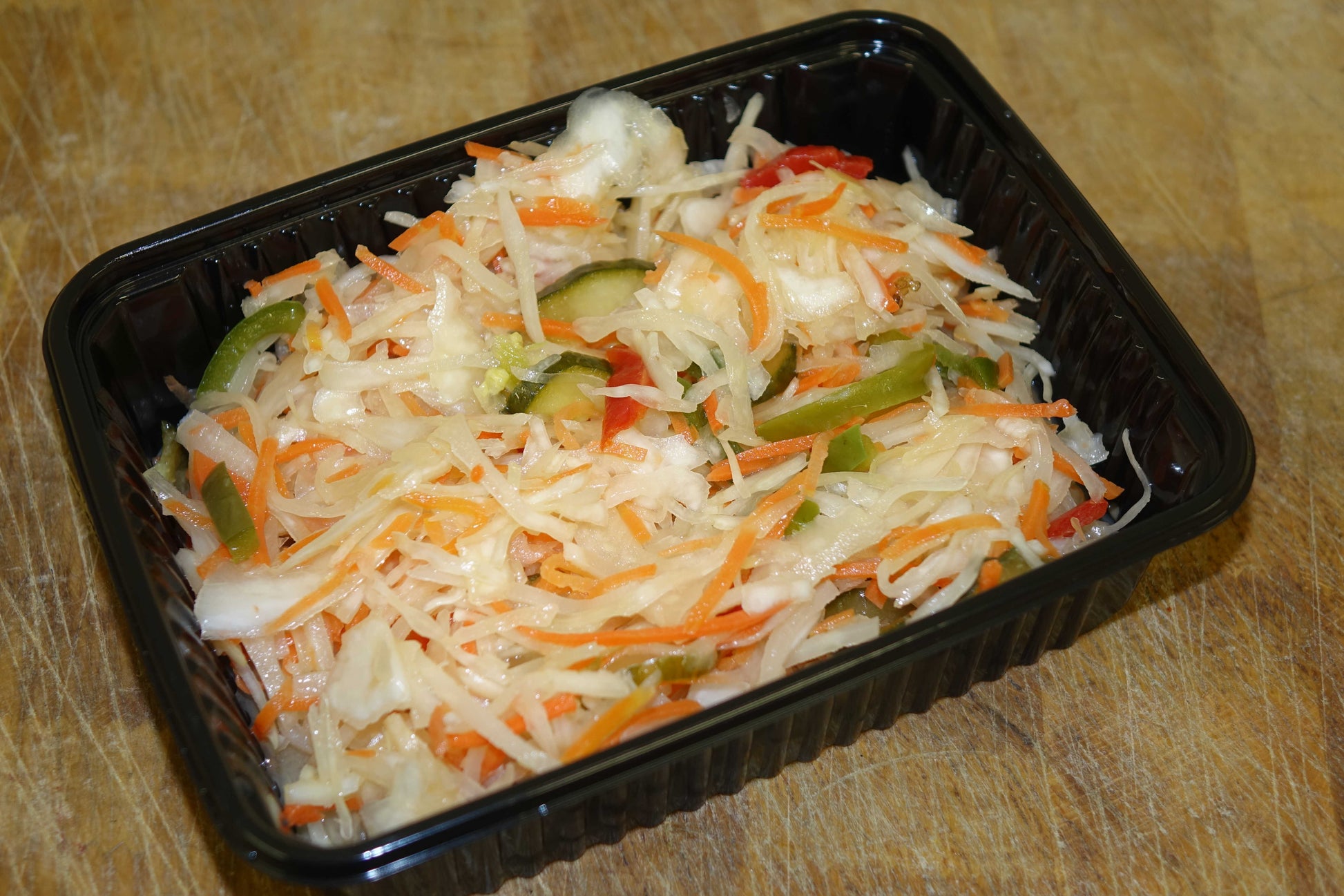 Ambachtelijke salade op basis van diverse soorten kool, wortel, komkommer en paprika.