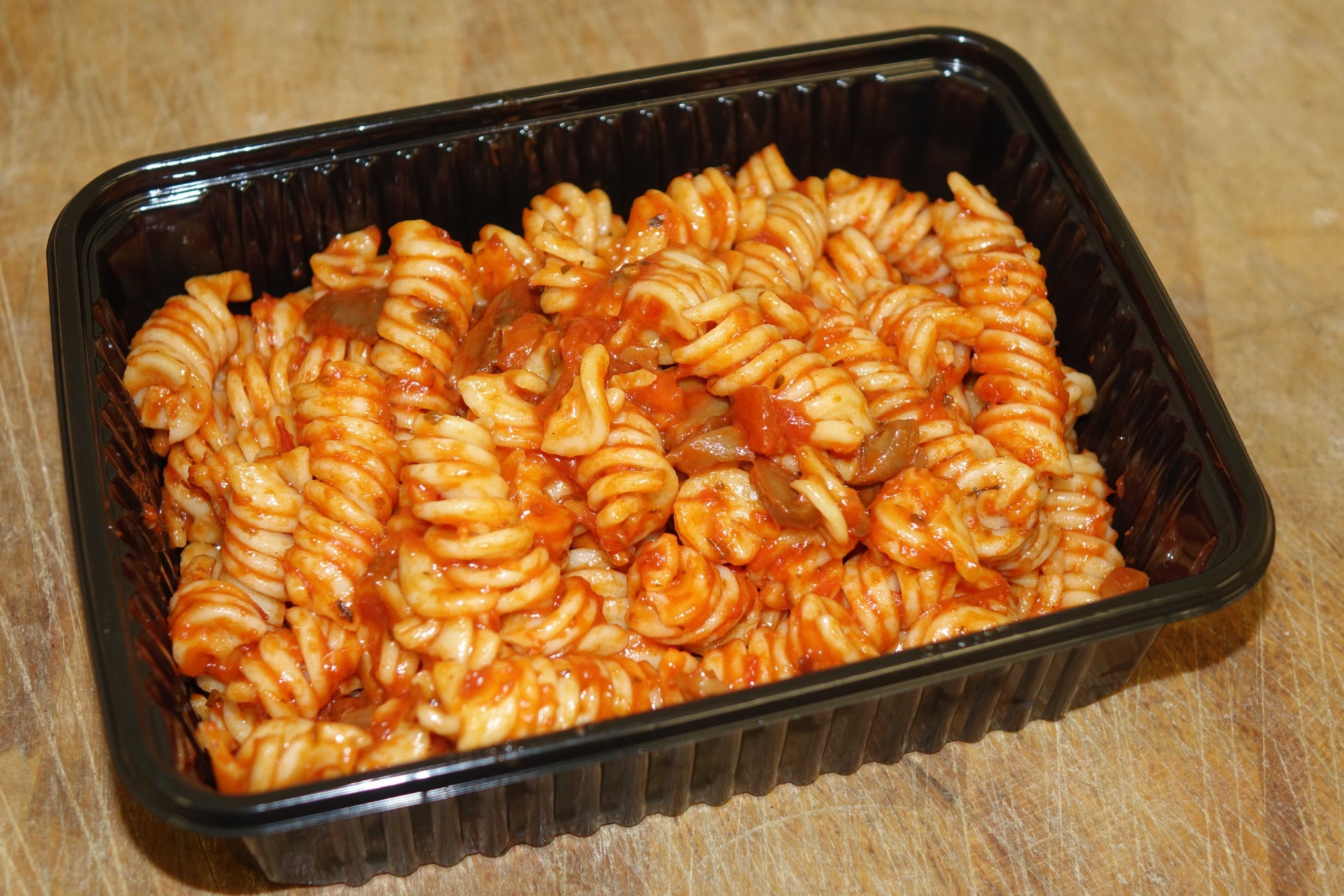 Pastasalade uit eigen keuken met tomatensaus, peterselie en champignons.