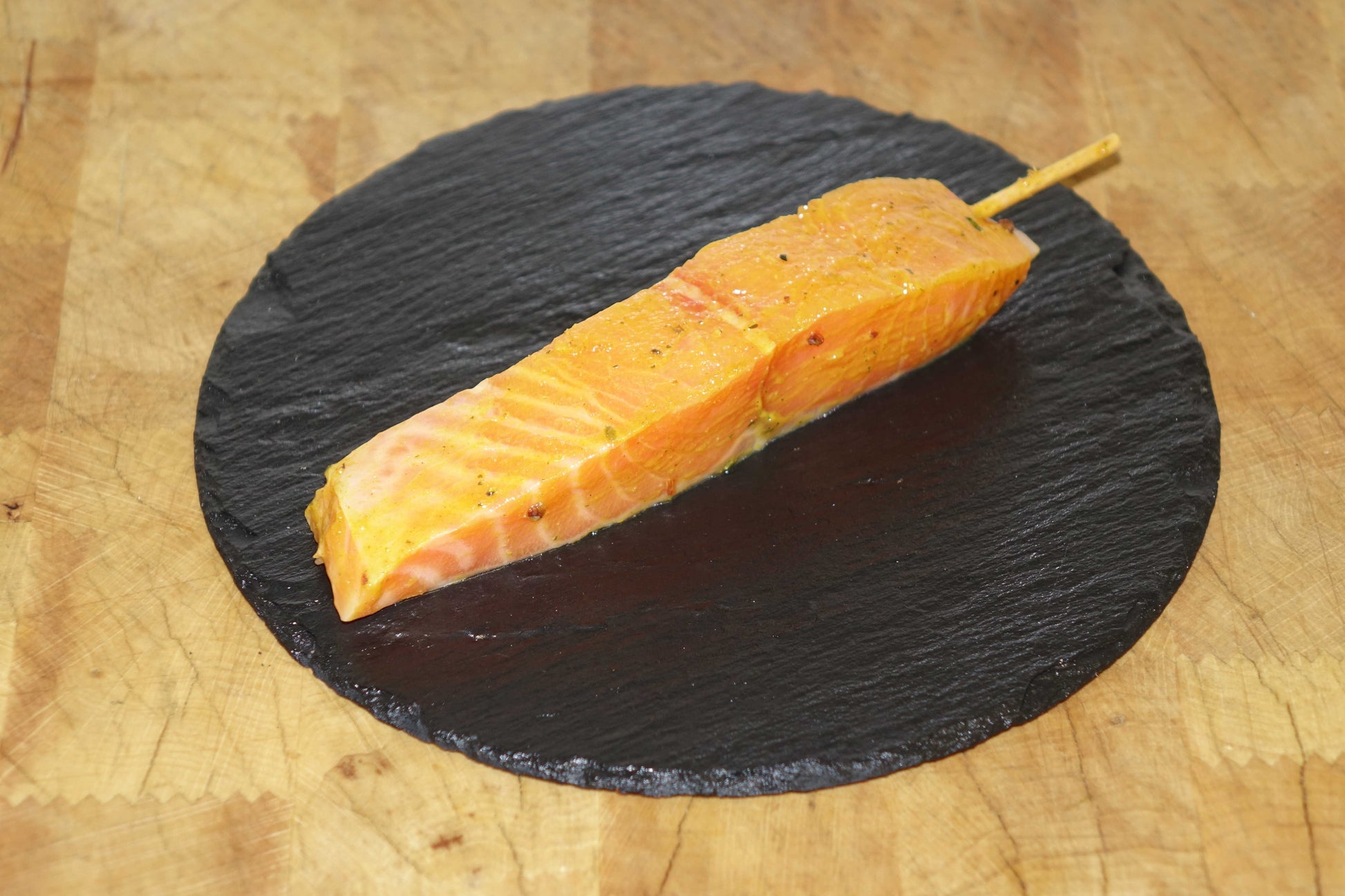 Zalm, voor velen een van de meest lekkere soorten vis. Zoals de naam al verraad hebben wij dit stukje zalm voor je gespiest, dat zorgt ervoor dat hij gemakkelijk te bereiden is. Bak visproducten altijd op een plaat of aluminiumschaaltje, zo voorkom je dat de vis in stukken breekt en door je rooster valt. De zalm is gekruid in een lekkere tropische marinade.