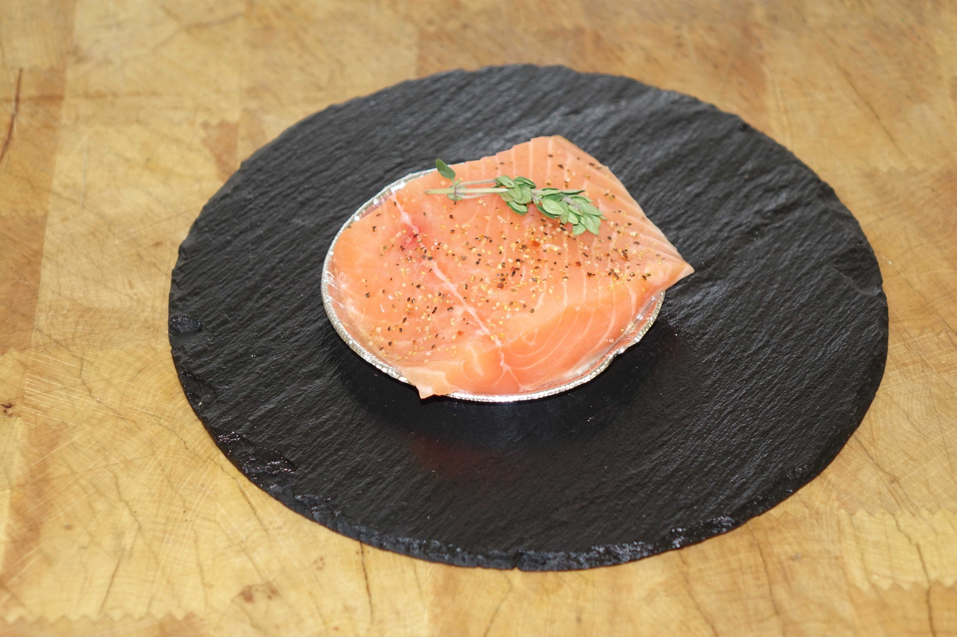 Stukje verse zalm gekruid met knoflook en peper. Geleverd op een aluminiumschaaltje zodat het ook op een roosterbbq te bakken is.